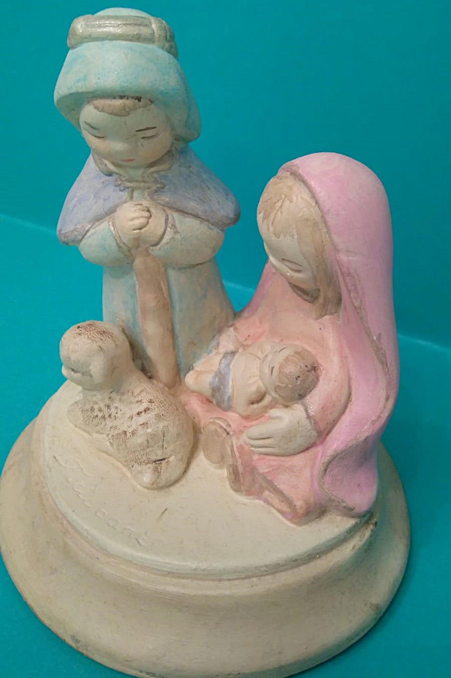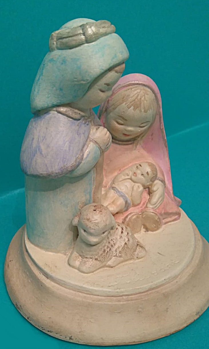 El nacimiento incluye en una misma pieza sobre peana: San José, Virgen con Niño y ovejita.