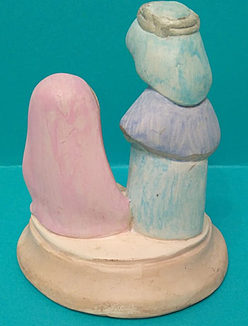 Nacimiento compacto de escayola pintado a mano en tonos pastel (rosa y azul) y patinado.