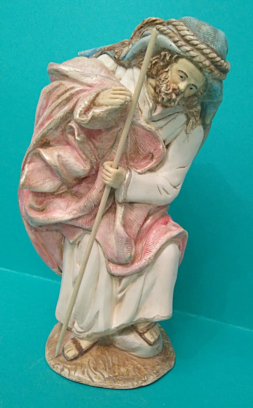 Nacimiento de escayola pintado a mano en tonos blancos, granate y azul y patinado.
